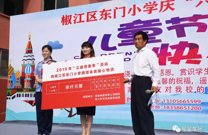 5月30日,星星集團團委聯合區市場監督局團委在椒江區東門小學開展了“青春公益行”體育器材捐贈揭彩儀式,在學校慶“六一”文藝匯演上,為孩子們送上了一份特殊的節日祝福。東門小學趙慶頌校長攜全體師生對兩位團委書記的到來表示了熱烈的歡迎,對星星集團及市監局此次的愛心捐贈表示了誠摯的感謝。