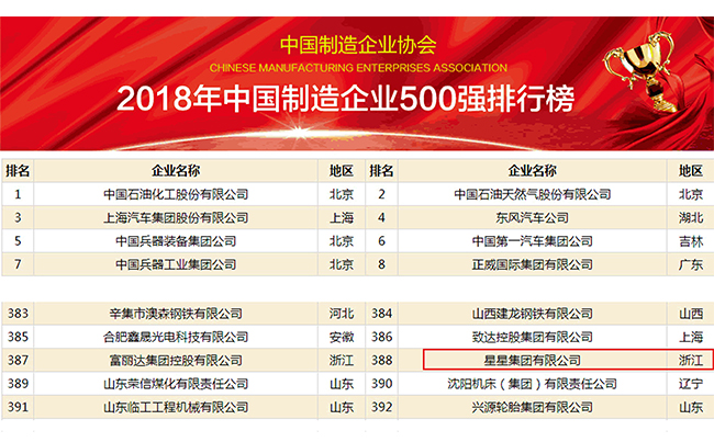 近日,2018年中國制造企業500強暨中國裝備制造業100強排行榜發布,星星集團名列第388位,較去年的404位進步了16位。
